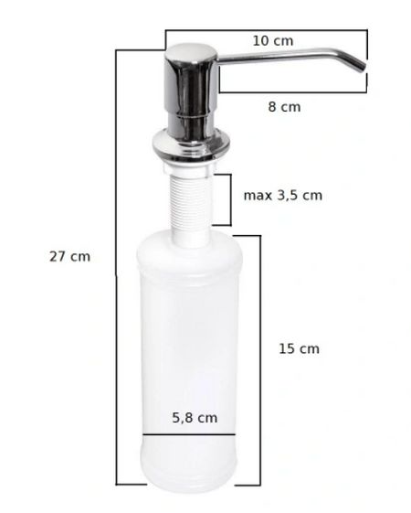 Indų ploviklio ar muilo dozatorių galima montuoti tiek į plautuvę, tiek į stalviršį. Aplikatorius chromuotas, o indas pagamintas iš ABS plastiko, kuris garantuoja jo patvarumą. Patogus papildymas padidina naudojimosi komfortą. Apdaila: chromas.