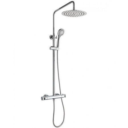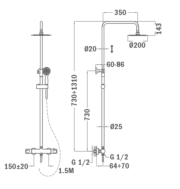 - Apvalus, reguliuojamas teleskopinis dušo stovas su stacionaria dušo galva ir dušo galvutės laikikliu: