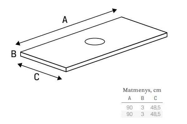 - Išmatavimai: gylis (C): 48,5 cm, plotis (A): 90 cm, aukštis (B): 17 cm