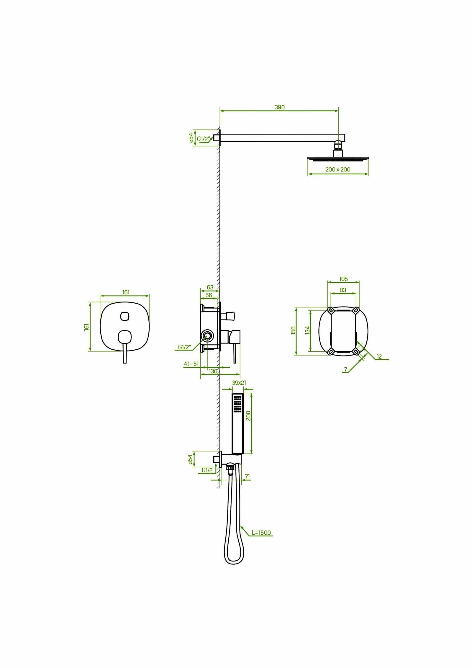 - Stacionarios dušo galvos matmenys: 200x200mm