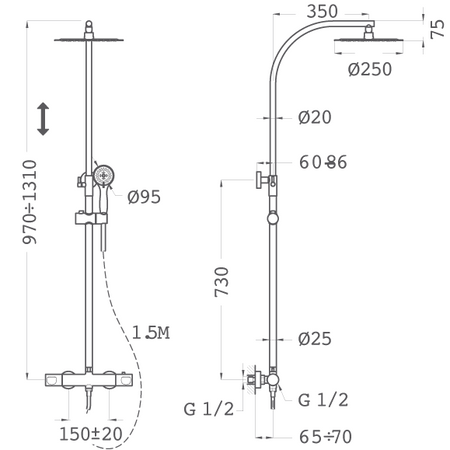 - Apvalus, reguliuojamas teleskopinis dušo galvos laikiklis: