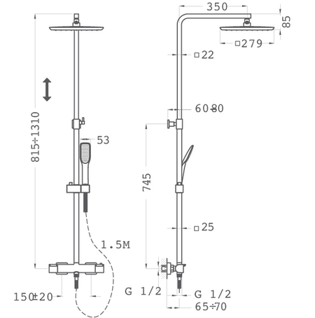 - Kvadratinis, reguliuojamas teleskopinis stacionarios dušo galvos laikiklis: