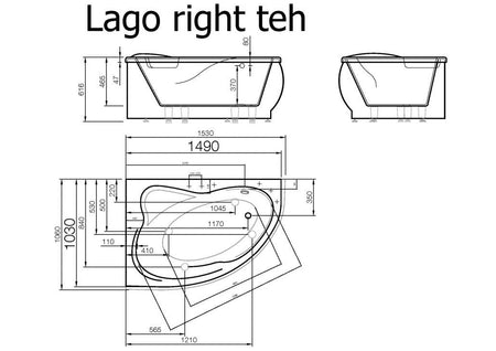 LAGO (right) - baltos spalvos, akmens masės vonia, 1530 mm ilgio, be sifono ir be fasadinio skydo