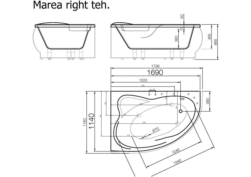 Akmens masės vonia Marea (right) 1736 mm ilgio, be sifono ir be fasadinio skydo