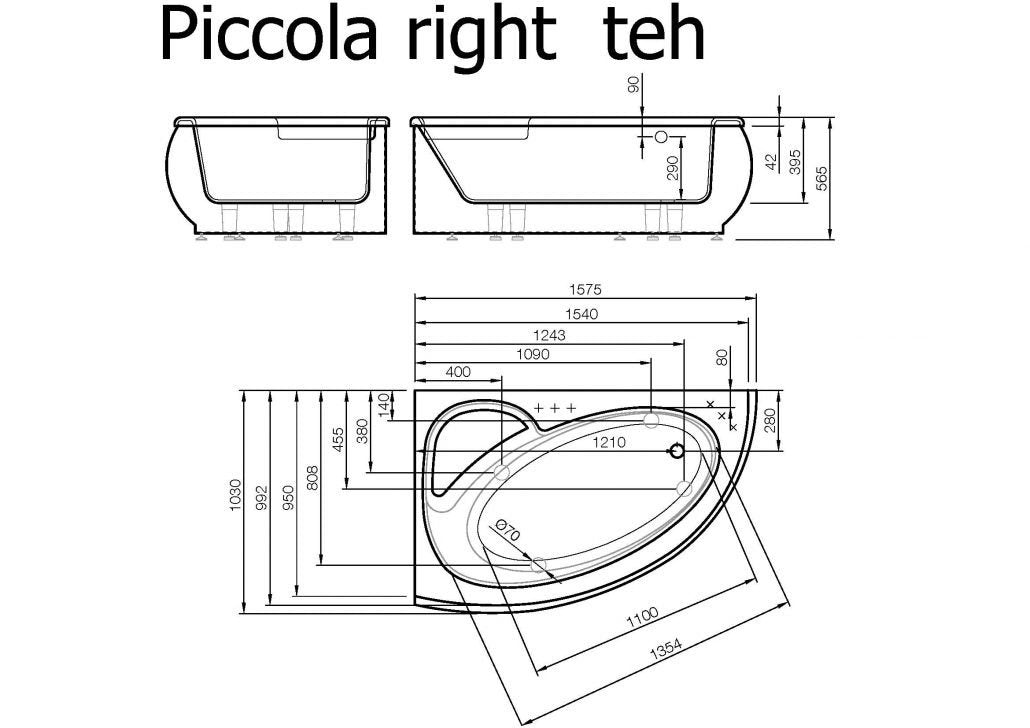 Akmens masės vonia PICCOLA RIGHT, 1575 mm ilgis, be sifono ir be fasadinio skydo